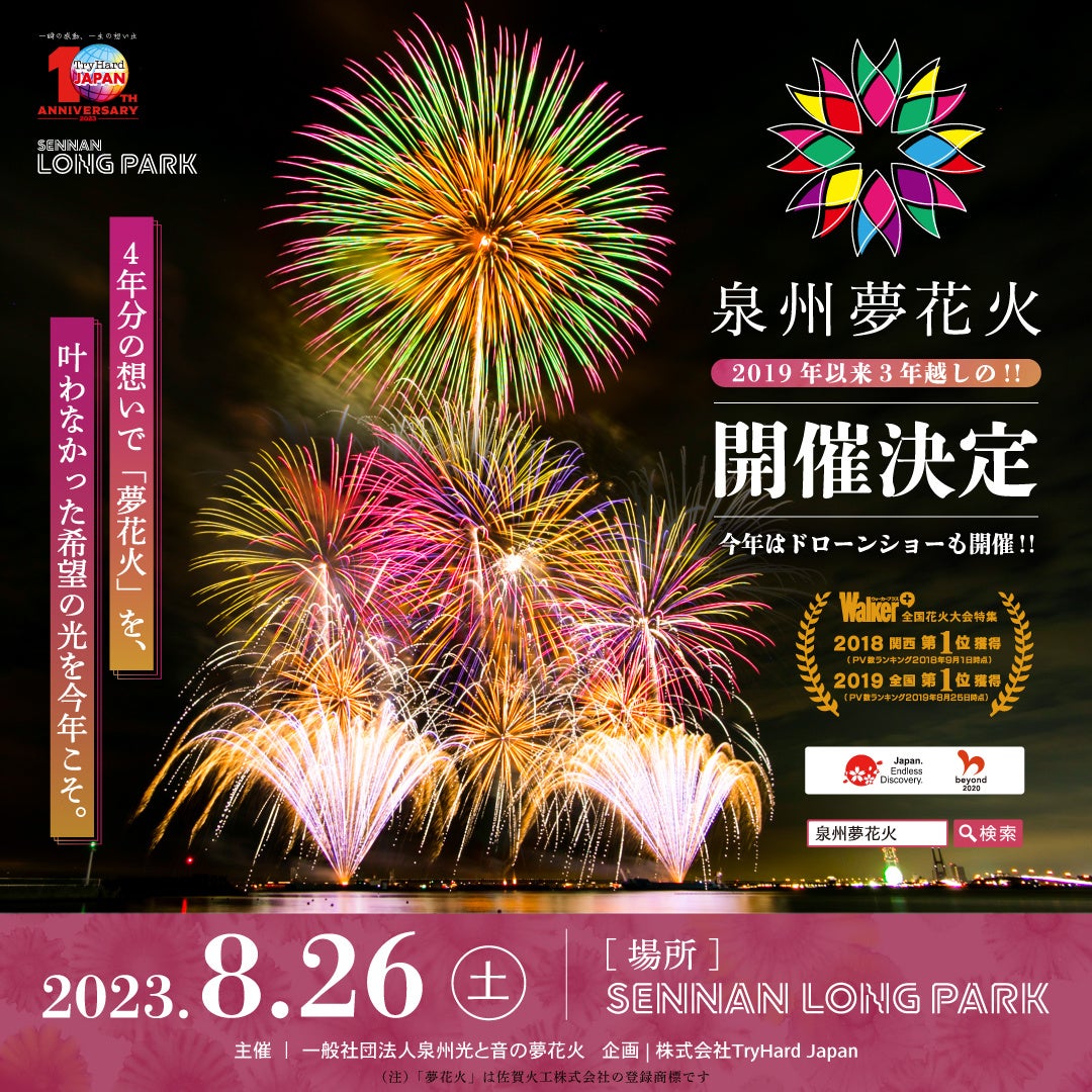 一般社団法人泉州光と音の夢花火(所在地:大阪市中央区)は、2023年8月26日(土)にSENNAN LONG PARK(センナンロングパーク)内、サザンビーチ(所在地:大阪府泉南市)にて、「泉州夢花火」を開催いたします。